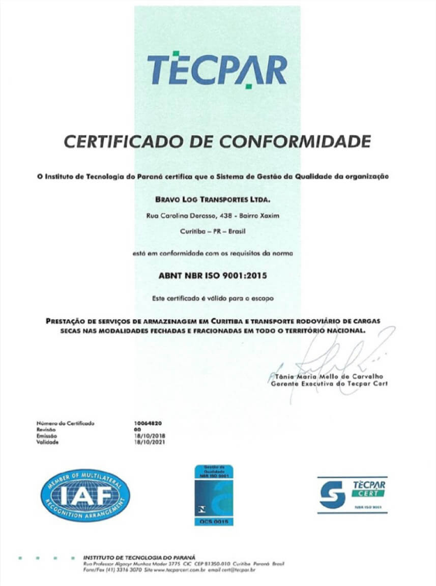Comprometida com a segurança e qualidade das entregas, a Bravox é uma transportadora certificada pelo ISO 9000 - um conjunto de normas e padronizações a serem seguidas para garantir excelência dentro de uma empresa.